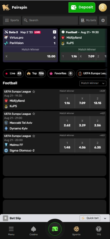 Naše platforma, poháněná špičkovou technologií, zajišťuje plynulý přechod mezi pre-match a live sázkami. Můžete si užít plynulé rozhraní a neustálé aktualizace kurzů, které vám umožní sázet přesně v ten pravý moment. Live Fairspin betting je dynamické a plné napětí, což posouvá vaše zážitky ze hry na zcela novou úroveň.